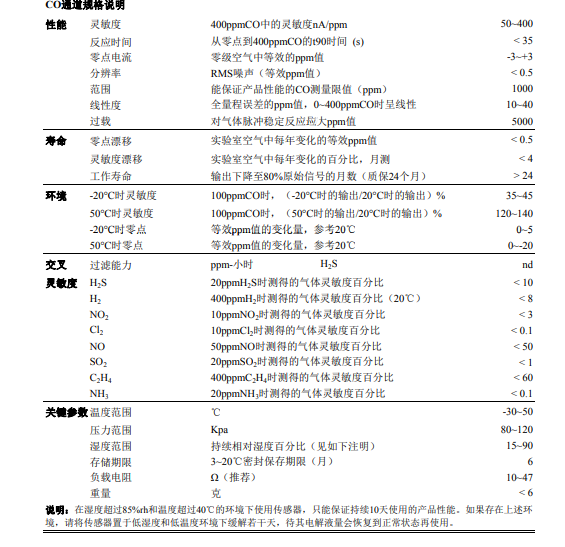 三、COH-A2 一氧化碳傳感器的通道技術(shù)指標(biāo):
