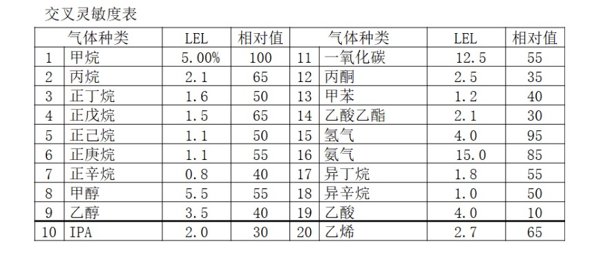 常溫下標(biāo)準(zhǔn)氣體濃度和潔凈空氣中的輸出值 |