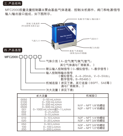 MFC2000質(zhì)量流量控制器的控制范圍可達100:1,可工作在為0.1~0.8MPa,?-10~50C,機械接口NPT 1/8*~NPT1/2",并可定制其他機械接口。