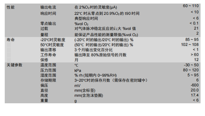 英國Alphasense O2 長壽命無鉛氧氣傳感器?LFO2-AH 參數(shù):