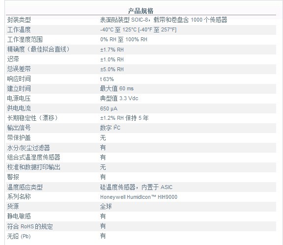 五、濕度傳感器HIH9000系列產(chǎn)品規(guī)格: