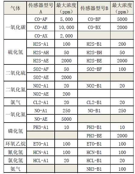 氣體傳感器變送器。如表1為傳感器量程。變送器與預(yù)標(biāo)定的傳感器一起提供。