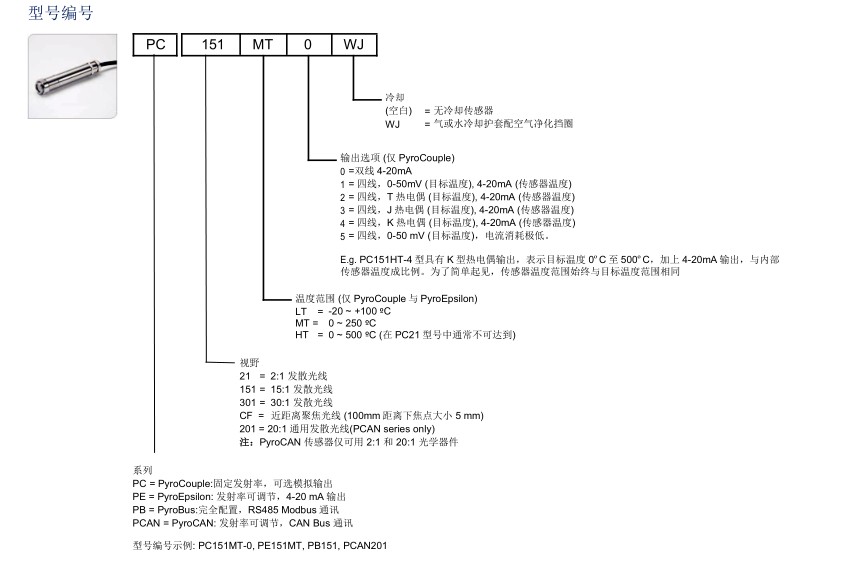 三、英國(guó)Calex Electronics Ltd 紅外溫度傳感器 PyroCouple,PyroEpsilon,PyroBus, PyroCAN產(chǎn)品選型: