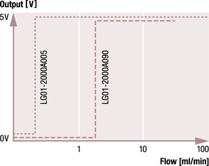 LG01系列流量開關傳感器檢測超低液體流量或流體系統(tǒng)中是否存在空氣從而使其更加可靠??蓽y微小流量低至毫升/分鐘甚至更小。傳感器的輸出信號0或5表明當前流量在設定開關值以上或以下。當流量大于設定值或氣道中有氣泡時,傳感器輸出一致。液體流量傳感器LG01基于非入侵性測量原理,可透過內(nèi)部玻璃毛細管壁實現(xiàn)對當前流體狀況的檢測。因此,該傳感器具備卓越的生物兼容性和耐化學性。液體流量檢測器可在低于100毫秒的響應時間內(nèi)進行測量。