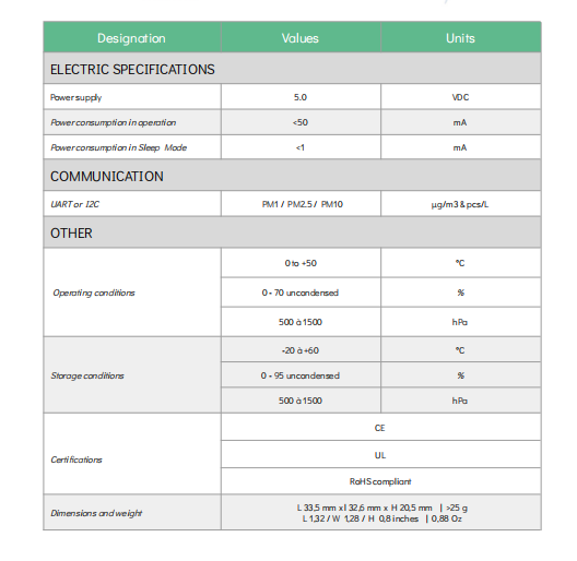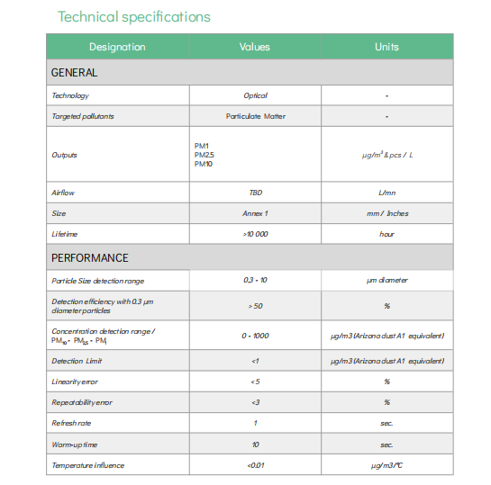 法國(guó)TERA  顆粒物傳感器 PM2.5傳感器  Next-PM-Lite 參數(shù):