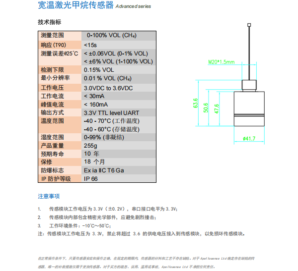 寬溫激光甲烷傳感器 AG-6-CH4-2842-100 特性: