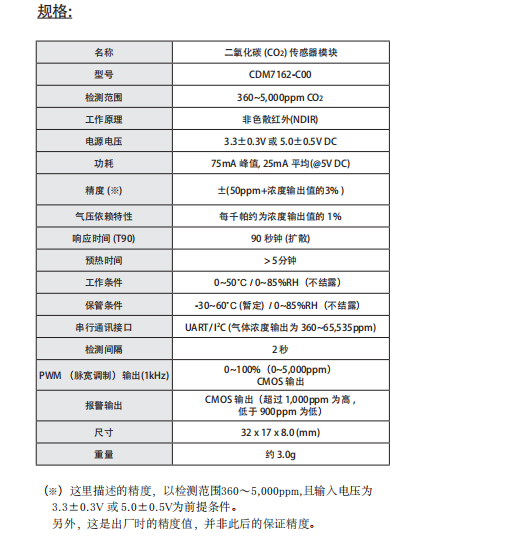 日本Figaro CO2 NDIR 二氧化碳傳感器模塊?CDM7162-C00 參數(shù):