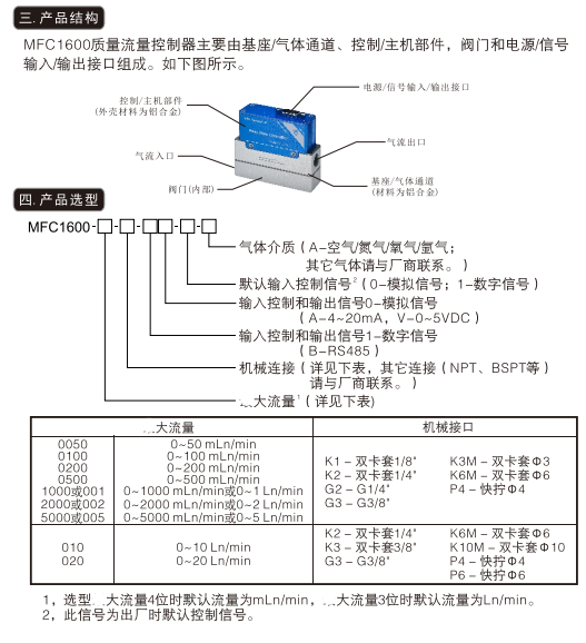 MFC1600質(zhì)量流量控制器的控制范圍可達100:1,可工作在0.1~0.8MPa,0~55℃,機械接口可選雙卡套、G螺紋或快擰接頭,并可定制其他機械接口。